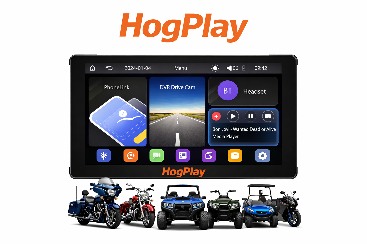 HogPlay media screens can work on a wide range of vehicles. Everything from Farm equipment, lawn equipment, ATVs, side-by-sides, Air Boats, Small watercrafts, PWC's, Golf Carts, Scooters, Wheel Chairs and commercial delivery vehicles.